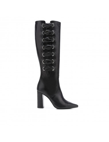 Bota alta por debajo de la rodilla fabricada en piel color negro. Adorno acordonado de piel en el lateral de la caña. Tacón ancho de 10 cm. Street Style y comodidad se aúnan en este modelo apto para todo tipo de ocasiones.