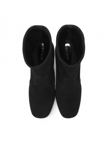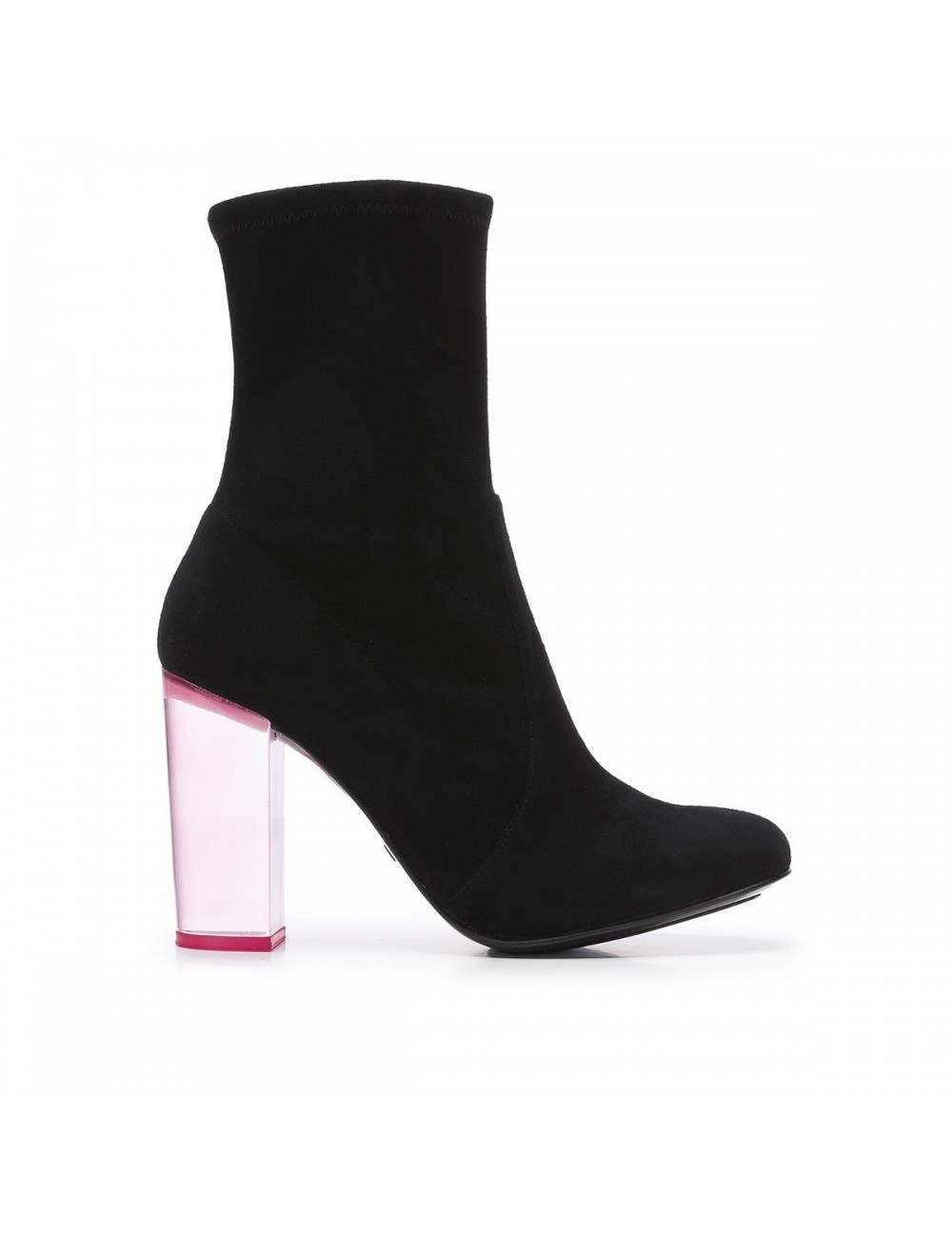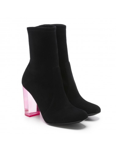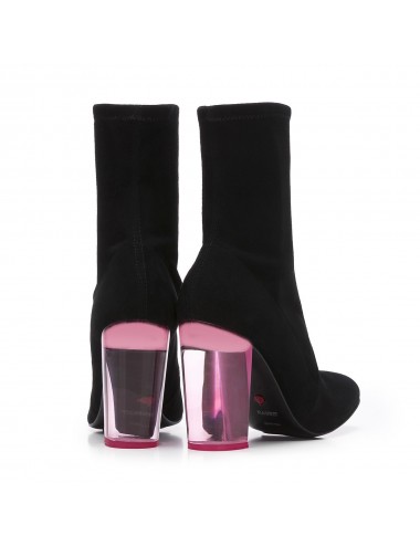 Botín de punta redonda fabricado en ante elástico negro. Original tacón de 10 cm fabricado en metacrilato de color rosa. Marca la diferencia en tus looks con este maravilloso tacón en tonos fluor. ¡Diversión y estilo en tus pies!