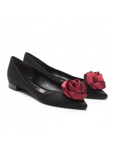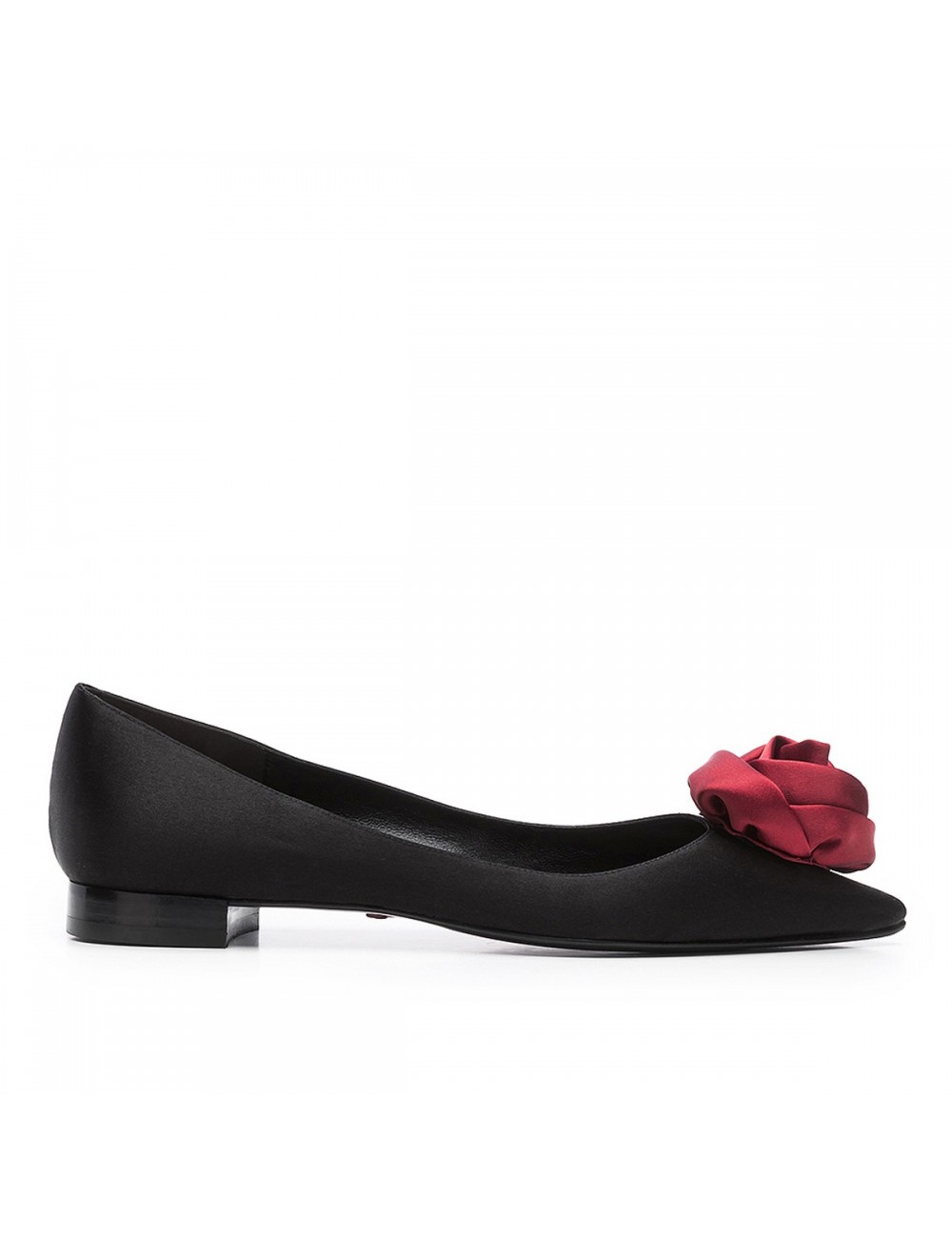 Bailarina de punta fina fabricada en raso negro. Adornada con una flor de raso rojo en la pala. Tacón de 2 cm. ¡Camina con estilo con estas bailarinas que se adaptarán a cualquier ocasión!