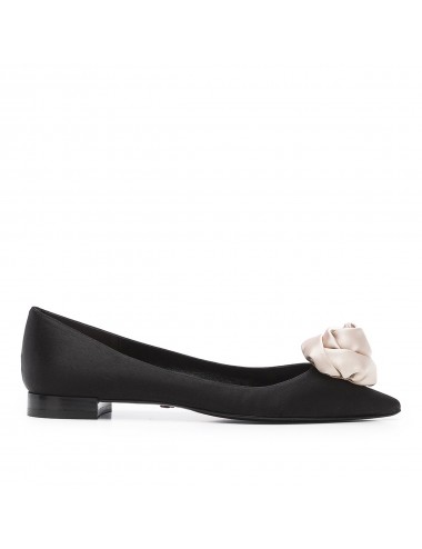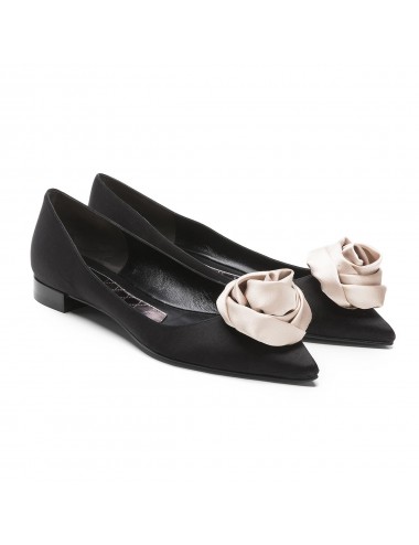 Bailarina de punta fina fabricada en raso negro. Adornada con una flor de raso nude en la pala. Tacón de 2 cm.  ¡Camina con estilo con estas bailarinas que se adaptarán a cualquier ocasión!