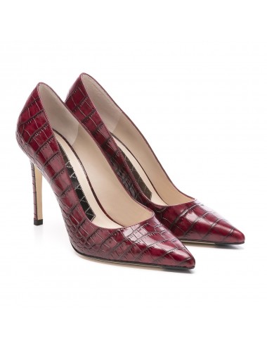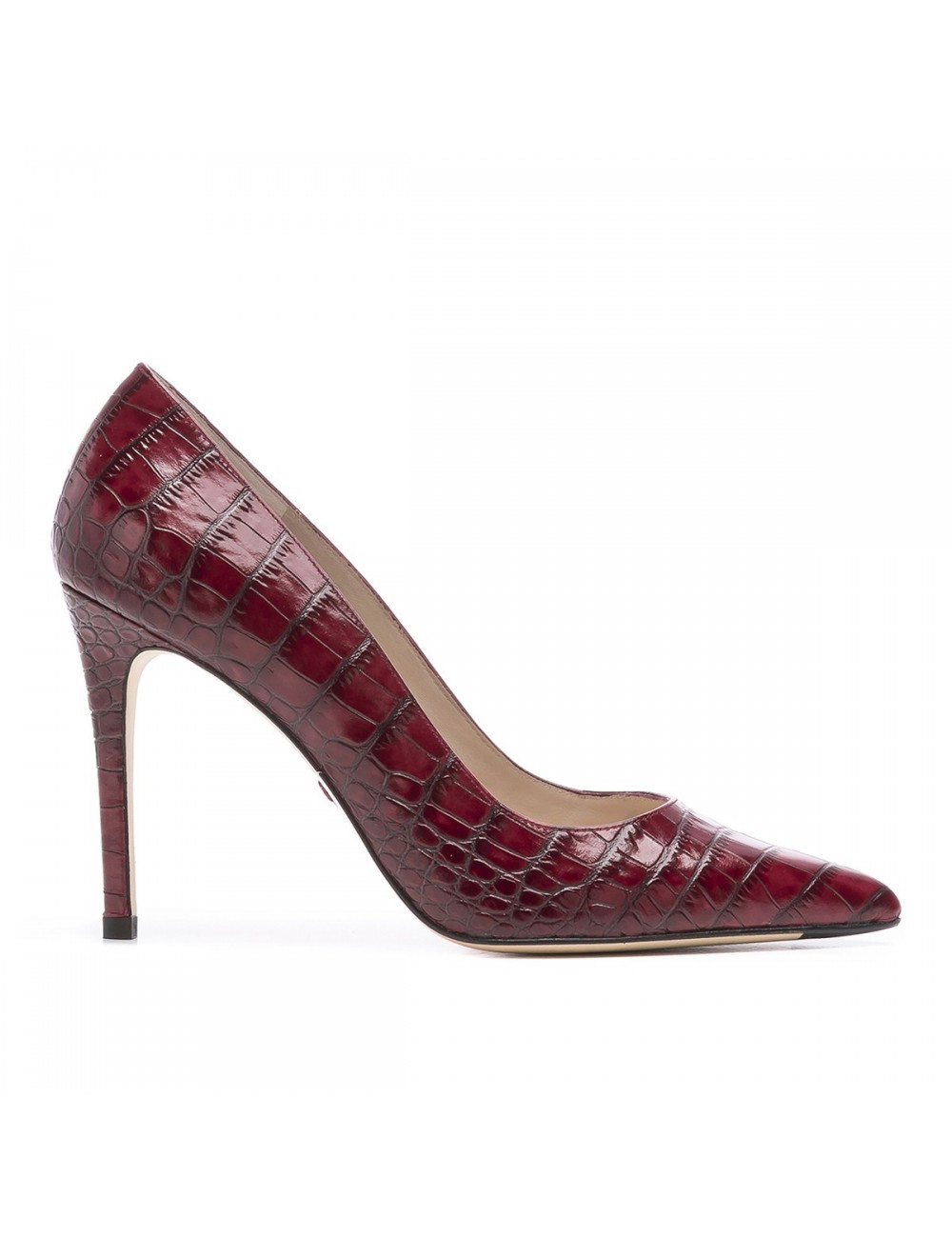 Salón de punta fina fabricado en piel grabada efecto cocodrilo en tonos burdeos. Tacón fino de 10 cm. Aprovecha este salón para llevar la tendencia animal print de la forma más femenina. ¡Camaleónica y con estilo para cualquier ocasión!